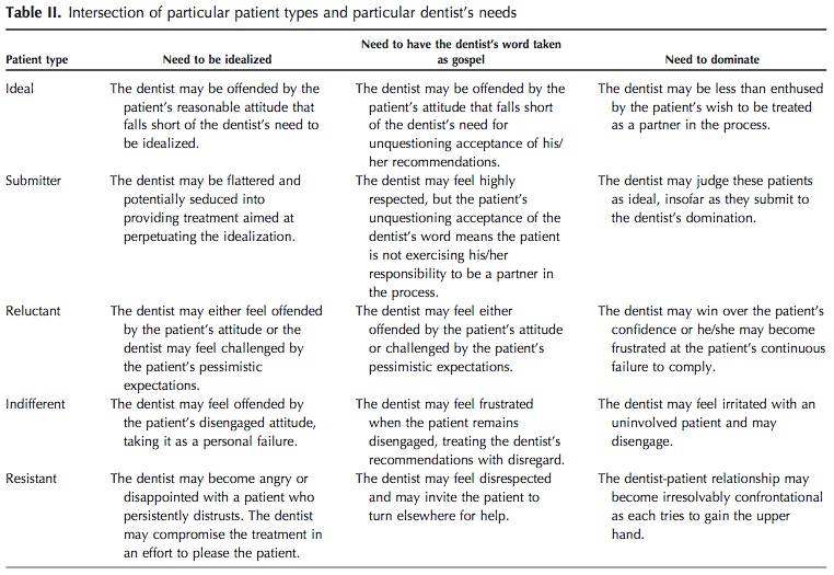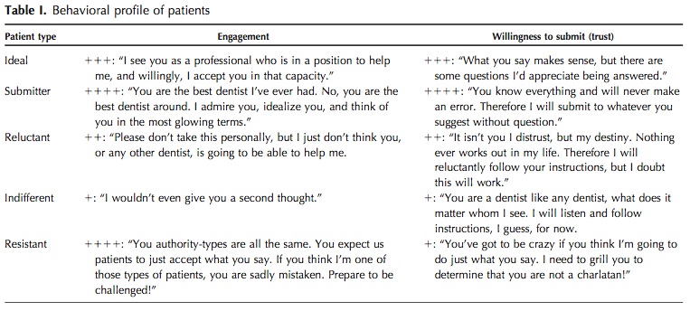 所以另一種分類法產生了, 這次分成五個等級:Ideal, Submitter, Reluctant, Indifferent, Resistant. 大致上來說這分類是依據醫師判斷患者對醫師的想法…其實這變成心理戰了!