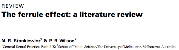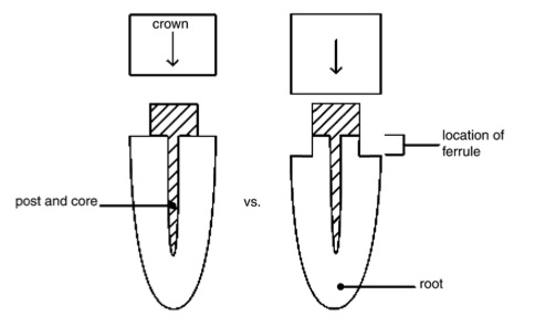Ferrule的意思就是在一個管子的末梢套上一個金屬的環或帽, 以增強它的物理性質. 在1961年Rosen的文章開始提到將一個黃金的環套住牙齒的cervical part並儘量向subgingiva延伸, 可以避免牙齒裂掉. 厲害的是應該是同一個Rosen在1996年為了證實他的說法, 使用76顆拔掉的上顎側門齒, 在其上套casting的金屬環, 然後用screw post向canal鑽, 直到牙根裂掉. 他的實驗證實有套金屬環的牙齒比較不會裂.