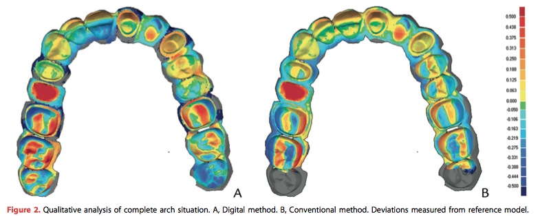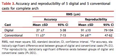 美國矯正學會已經可以用數位模型當成在考專科醫師用的模型了, 但是對於假牙贗復醫師來說, 需要的精準度更高. 這個實驗使用3M ESPE Lava Chairside Oral Scanner和VPS impression material做比較.