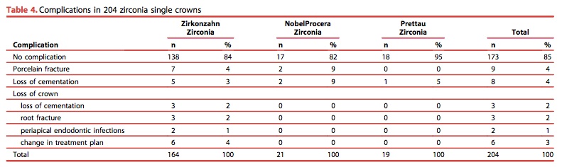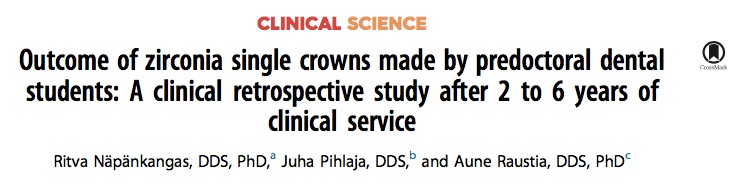這篇文章是在描述在芬蘭的牙醫學院中, 讓牙醫學生在88位患者中使用了268顆Zirconia crown. 使用的系統是Zirkonzahn Zirconia (Zirkonzahn), NobelProcera Zirconia (Nobel Biocare), Prettau Zirconia (Zirkonzahn). 其中內層的zirconia至少有0.4mm在前牙而0.7mm在後牙.
