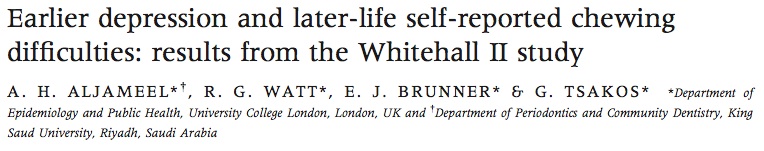 Whitehall II study是一個長期的研究, 這研究計劃在1985年選擇了10308位倫敦的居民然後長期追蹤其社經及其他健康等情況. 研究團隊選擇了其中227位, 使用CES-D score評估憂鬱的情況(0-60分, 超過16分就稱為憂鬱). 先擷取了2003-2004, 2008-2009的資料然後在2011年發問卷讓受試者自行填寫覺得自己咀嚼的功能如何.