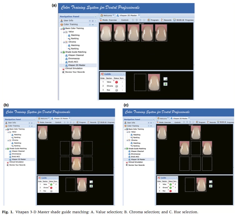 這實驗是在70位學生中使用幾套線上教育比色系統, 看看這樣的訓練會不會增進學生比色的正確性. 結果當然是有效的, 尤其是Vitapan 3D-Master是最明顯準確的, 看到最後都想買一套了…說不定是廠商贊助?