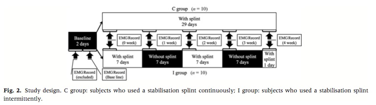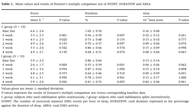結果相當的有趣, 就是戴一週然後休息一週不戴的組別的Masseter m.比較減少activity, 持續戴的那一組在第一週有很大的改善但是之後都差不多維持而已. 希望未來看到更多類似的RCT研究.