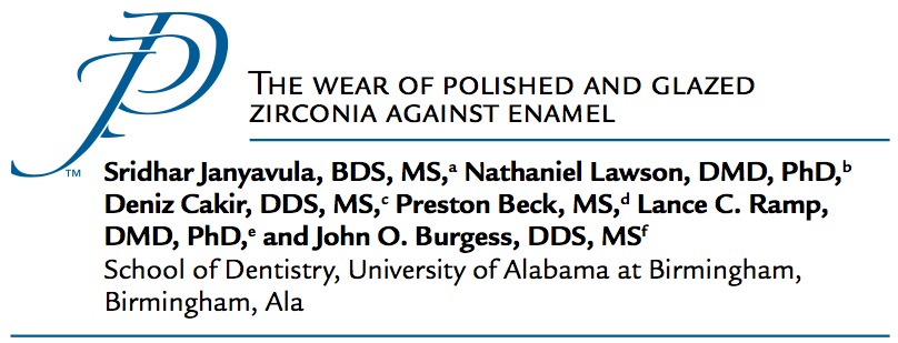 這個實驗室在研究enamel在相對應于不同表面質地的zirconia時的磨耗. 這個實驗中有5個group, 1. polished zirconia, 2. glazed zirconia, 3. polished then reglazed zirconia, 4. veneering porcelain and 5. enamel. 每個group都有8個specimen.