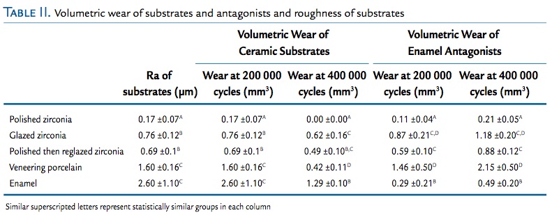 以表面的粗糙程度來說, polished zirconia是最光滑的, 接著是polished then reglazed和glazed zirconia. veneering porcelain和enamel是比較粗糙的.