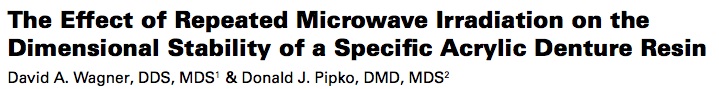 使用微波爐去消毒全口活動假牙(不能有金屬, 所以RPD或是有mesh的都不行)乍聽至下會覺得不可思議, 但是在微波爐盛行的美國, 什麼都有可能會發生. 這篇研究使用PMMA製作的全口活動假牙, 浸泡在200ml的室溫水, 在420W及700W的微波爐中加熱3分鐘, 冷卻後去量測有沒有變化.反覆測試兩次.