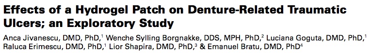 在佩戴活動式假牙時, 尤其是剛開始的時候會常見患者有oral ulcer的情況. 這篇研究是用一種叫做"PerioPatch"的Hydrogel patch. 在23位有兩處以上的oral ulcer患者中,在比較大的ulcer貼上PerioPatch, 跟比較小的ulcer去比較healing速度.第一天每8小時換一片, 然後接下來的三天一天換一片.