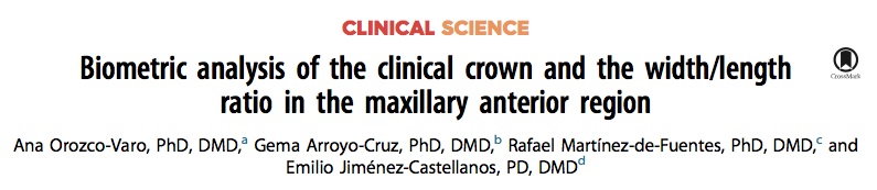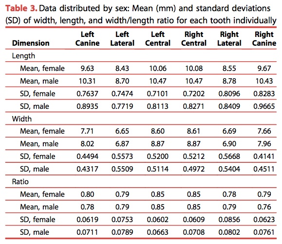 統計上顎前牙的尺寸大小—Orozco-Varo(2015) 2015 年 09 月 06 日2015 年 09 月 05 日 yehhsinchi 診斷、固定式假牙診斷、固定式假牙 JPD 2015 Vol.113 P.565-570 這一篇研究是在西班牙所做的, 因為西班牙是屬於南歐, 身材跟東方人較相近, 所以這篇瑣統計的數值是可供參考的. 在美學的領域中, 上顎前牙是相當重要的, 我們通常會希望將不正常的牙齒尺寸大小回復到相對來說正常的大小, 那到底上顎前牙的大小是多少呢? 平均的上顎正中門牙長10.23mm, 寬8.71mm; 上顎側門牙長8.59mm, 寬6.75mm; 上顎犬齒長9.93mm, 寬7.81mm. 男女有明顯差異, 男性的牙齒較大. 另外上顎正中門牙的寬長比為85%, 上顎側門牙的寬長比為79%. 正中門牙和側門牙的比例為1.27, 和黃金比例差異很大. 分享此文: 按一下即可分享至 X(在新視窗中開啟) X 按一下以分享至 Facebook(在新視窗中開啟) Facebook 喜歡 正在載入...