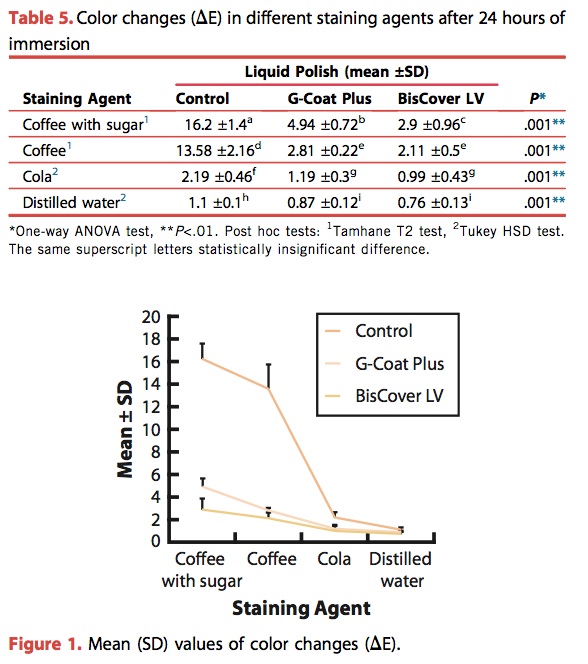 結果這兩種liquid polishing: BisCover LV 和 G-Coat Plus都有讓臨時假牙更不容易變色的效果.