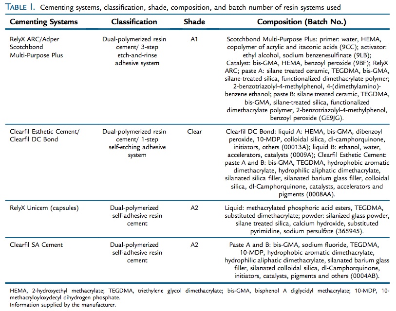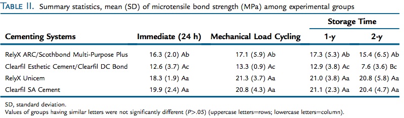 這篇研究是在比較傳統的resin cement和self-adhesive resin cement黏著在dentin的效果. 在128顆human molar上使用兩種傳統的resin cement和另外兩種的self-adhesive cement, 黏著後浸泡在人工唾液, 比較在24小時,一年及兩年後的microtensile bond. 結果是self-adhesive 黏著在dentin的效果明顯比傳統的還要好.