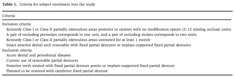 之前有幾篇文章是關於SDA(shorten dental arch), 那到底在後牙有做RPD或是implant FPD會不會增加咬合的能力呢? 這篇文章是去評估在125位患者中, 其中有53位是做no treatment, 53位是做RPD, 19位是做implant FPD. 評估的方式是用Oral health-related quality of life (OHRQoL).