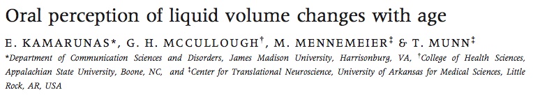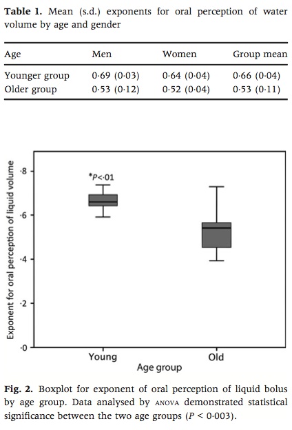這篇研究有點複雜, 不知道未來還會不會看到類似的研究. 在依照年紀分成的兩組人中(平均31歲和平均69歲), 隨機給予1,5,10,15,20ml的水, 然後請受試者去判斷液體有多少. 結果年輕的受試者明顯能夠判斷的比較精確.
