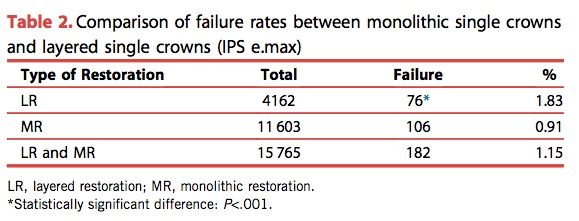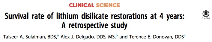 Lithium disilicate, 一直是我心目中屬於理想的補綴材料. 對於這種材料因為很新, 所以比較少有RCT的研究去看它的存活率. 這篇文章是統計2009-2014之間, 一共有15802個monolithic以及5538個layered restoration. 去看看他們的fracture rate.