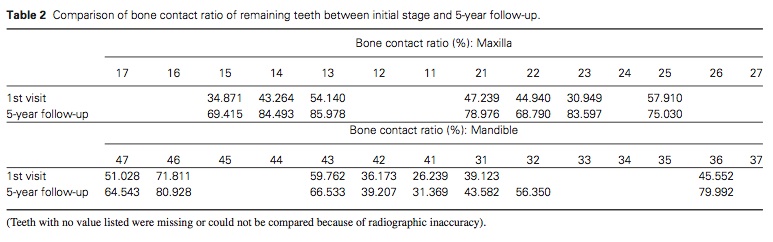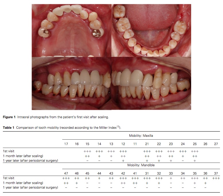 這個case report是一個49歲的女性患者, 因為全口牙周病以及後牙缺牙, 一開始看起來很糟糕的情況. 治療只拔除了左下7, 然後做了牙周的phase I and II的治療, 在上顎後牙各植了2顆ITI. 五年的追蹤下結果相當的理想. 我目前也有case是類似這樣的情形, 在後牙以植牙重建後牙咬合後, 前牙原本mobility III的牙齒竟然完全不搖了…但是我並沒有將剩下的牙齒splinting起來, 這我需要再評估看看. Splinting是雙面刃, 如果因為不好清潔而牙周更糟糕反而全盤皆輸.