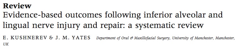 這篇文章回顧了1950-2013年的文章, 有關於下齒槽神經及舌神經受損之後的修復相關事情. 在366篇文章中, 選出了27篇文章, 然後統計出一些結論: