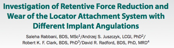 這篇研究是去比較三種情況下, locator system的retention效果如何. 我是覺得它只有設定三種情況, 就是平行, 一隻偏10度, 兩隻各偏5度是比較保守了點, 臨床上往往會差更多…然後在cycles use之下, 雖然在720 cycles(模擬六個月的使用), retention降低很多, 但還是比廠商提供的數據好. 聽說新的locator system要上市了, 在現有的locator系統已經上市十年之後, 不知道會有什麼改變.