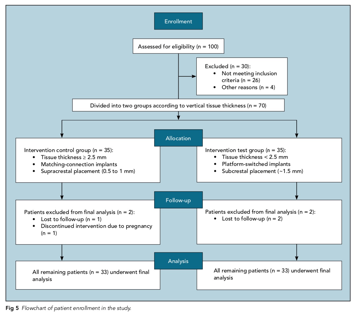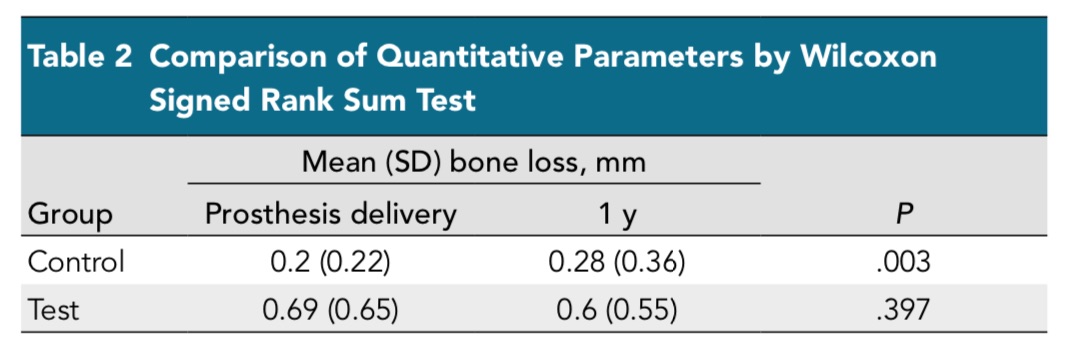 結果控制組在一年後的bone loss平均為0.28mm(SD: 0.36mm), 實驗組一年後的bone loss為0.6mm(SD: 0.55mm) 。厚的軟組織可以減少crestal bone loss。