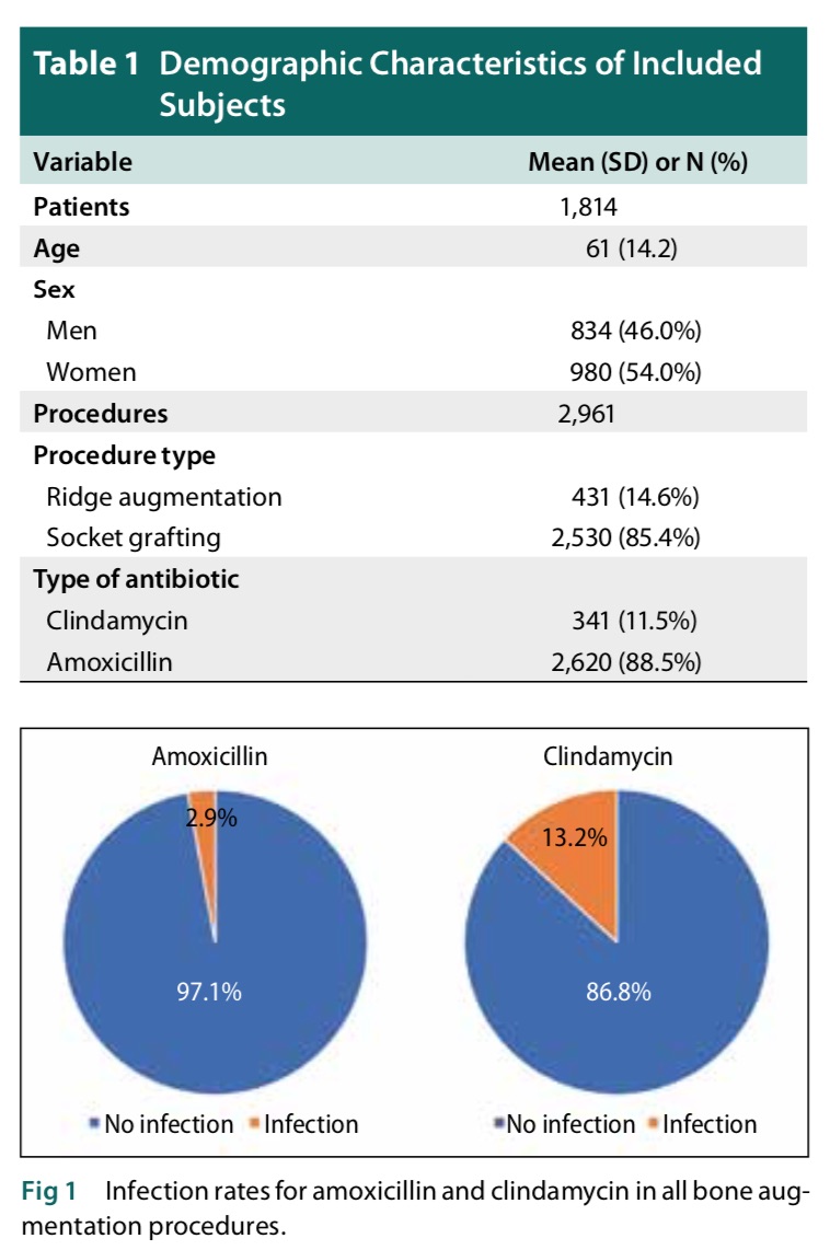 這篇回顧性研究是去回顧,在做Socket grafting or Ridge augmentation,我們通常會給予術前術後抗生素。一般的準則是給予Amoxicillin,但是會有Penicillin過敏的患者,這時我們通常會改用Clindamycin。但是效果一樣嗎?