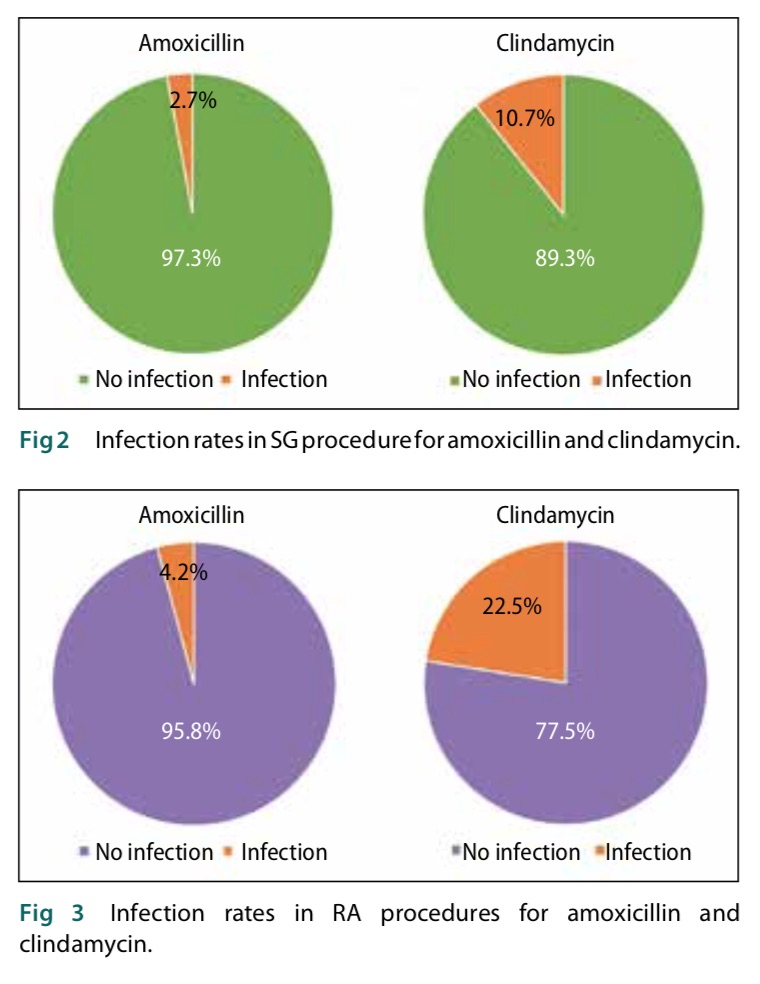 統計上的結果,使用Amoxicillin,整體上的infection rate是2.9%; 使用Clindamycin,整體上的infection rate是13.2%。