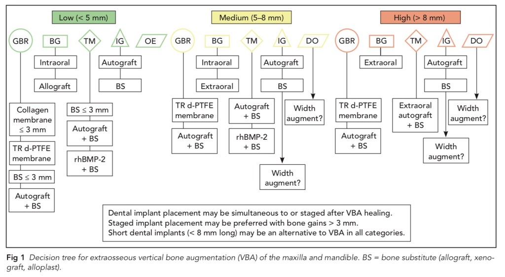 這篇文章是去分成Low(小於5mm),Medium(5-8mm),High(>8mm)的垂直骨喪失,然後有五個術式:GBR(Guided bone regeneration),BG(Block grafts),TM(Titanium mesh),IG(Interpositional graft),DO(Distraction osteogenesis)。另外在小於5mm還有OE(Orthodontic extrusion)。