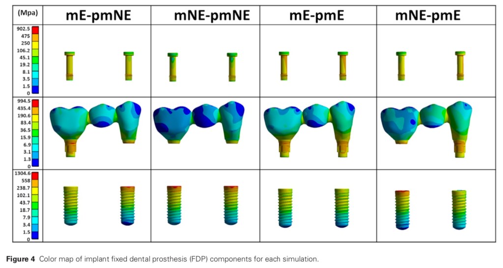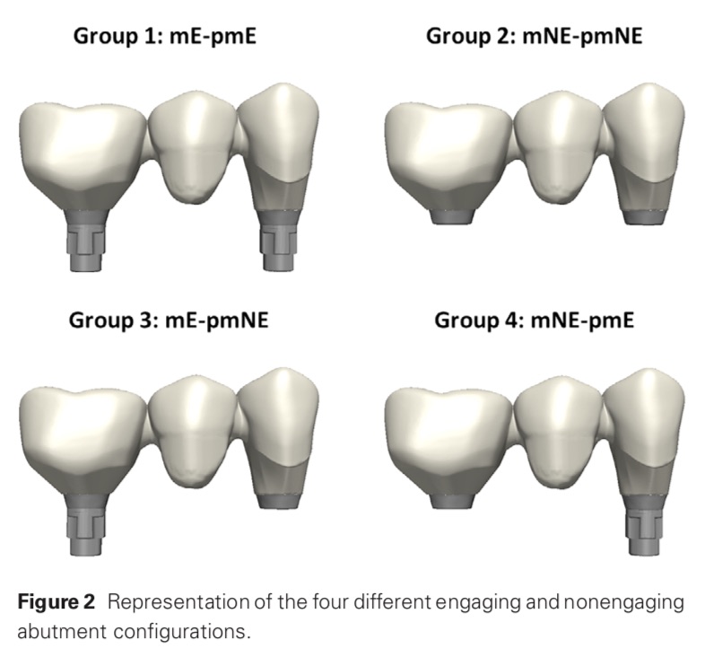 在植牙的abutment,有分成兩種,就是Engaging跟Nonengaging。差別在於abutment插進去植體的深淺…所以Engaging會比較穩定,而Nonengaging比較靠abutment screw去固定。那我也是比較少看到這樣的電腦分析,他是在設定一個3 unit implant screw-retained bridge,一個premolar跟一個molar。所以有四個設定,兩個都是Engaging跟兩個都不是Engaging,然後各設定一個Engaging另一個Nonengaging。