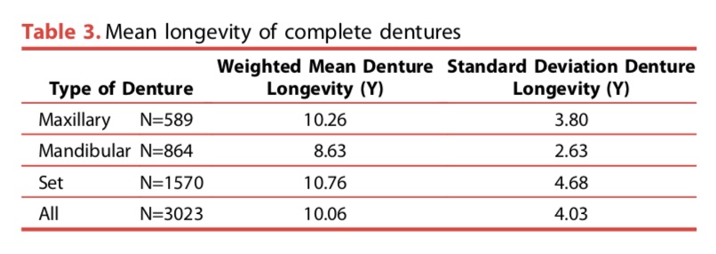 這篇回顧性的文章,整理出來,上顎是10.26(標準差3.8),下顎是8.63(標準差2.63)。整體說是10.06(標準差4.03)。所以看起來若是正常製作的全口假牙,我想應該可以預期能夠使用到7年以上,因為材料也會老化,屆時應該是要視情況來更換新的假牙。