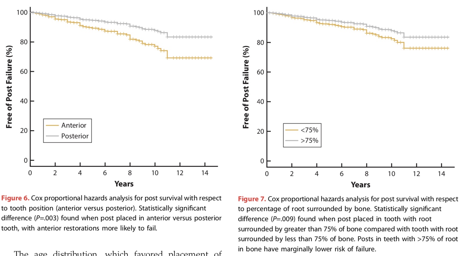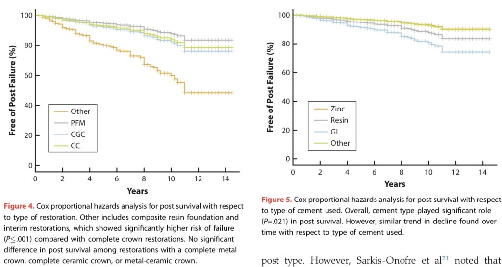 這個回顧性的研究是去統計dental school,在754支post的長期追蹤下結果如何。三種post分別為prefabricated metal,Fiber-Reinforced composite,Cast metal三種post。