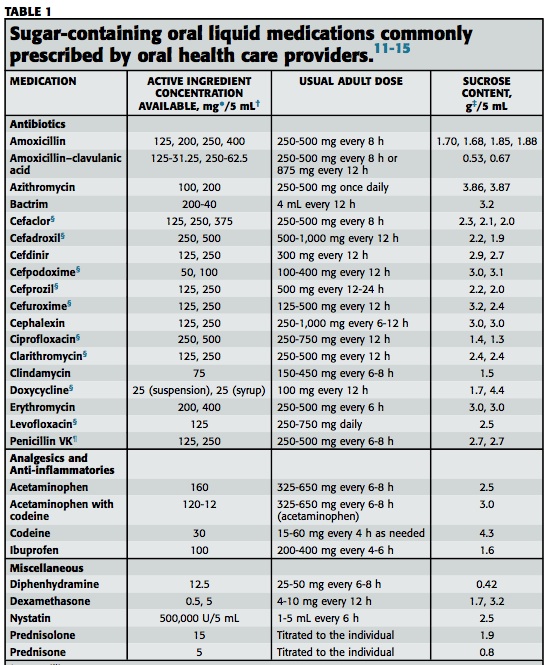 作者群回顧了超過50種常用的口服糖漿形藥物, 發現含糖的成分都很高. 所以有遇到有在長期服用糖漿的患者, 更要注意口腔的清潔以免造成蛀牙.