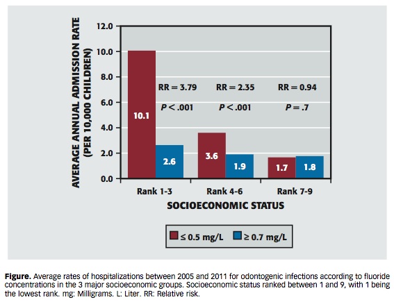 飲水加氟, 這個題目一直都是很熱門的牙公衛議題. 這是Israel的研究, 在某些區域有飲水加氟但是有些區域沒有實施. 他們的認定是每公升大於0.7mg的氟才算是有添加. 結果是在中低收入的家庭的兒童蛀牙或其他齒源性感染率有降低, 但是在高收入家庭就沒有差異.所以有添加還是會有效果的.