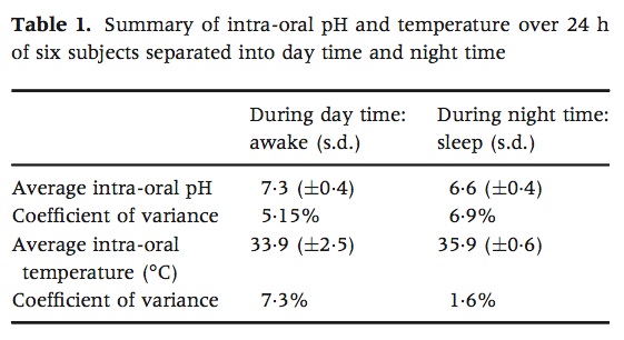 這篇文章是在研究一般人口內的溫度及環境在24小時內的變化, 這個研究是使用1mm的vacuum 美白牙托黏著特製的儀器, 佩戴24小時, 一共有6位受試者, 然後統計結果.